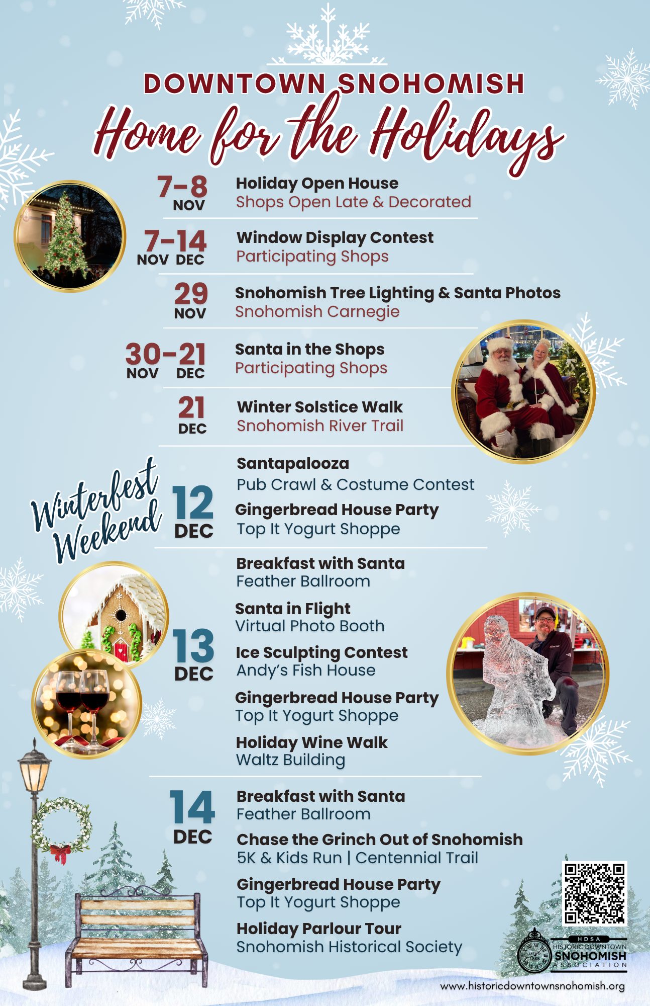 Bundle up and head to Downtown Snohomish for Winterfest, a magical weekend filled with festive events for the whole family! Check out the full schedule of events below to start planning your perfect holiday adventure in charming historic downtown Snohomish.